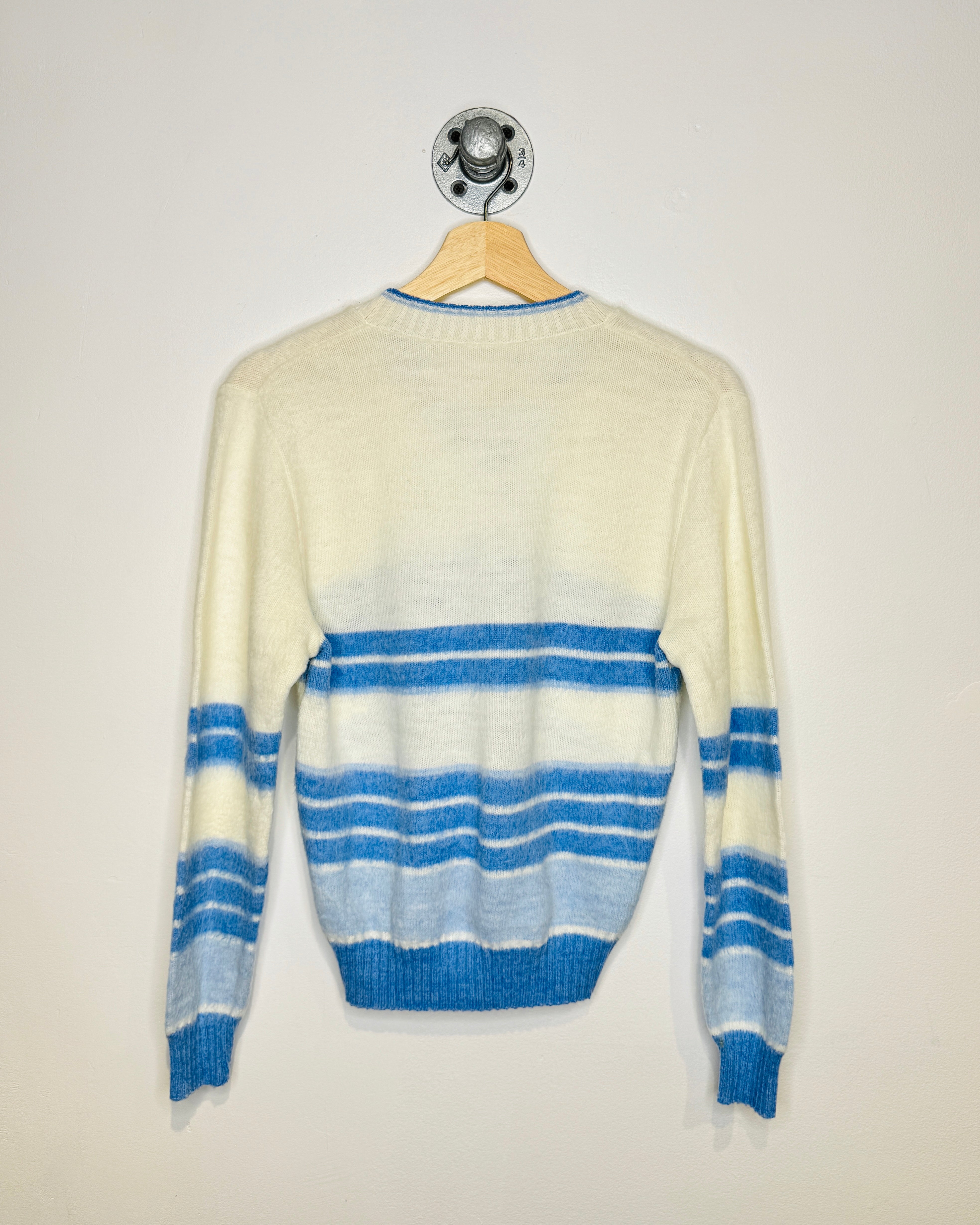 Vintage 80s Elegant White & Light Blue V Neck Sweater