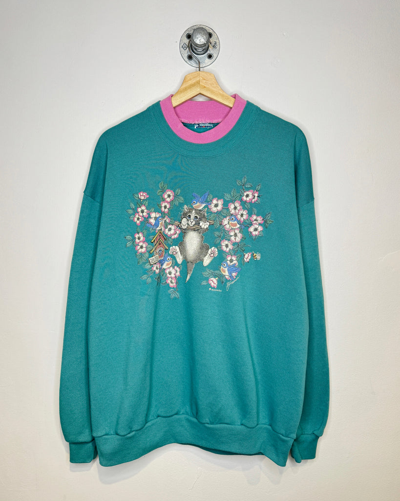 Vintage 90s Morning Sun Kitten Teal Crewneck Sweatshirt